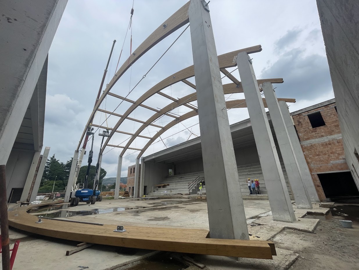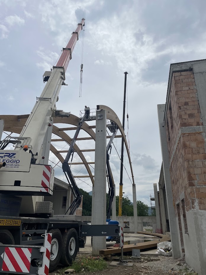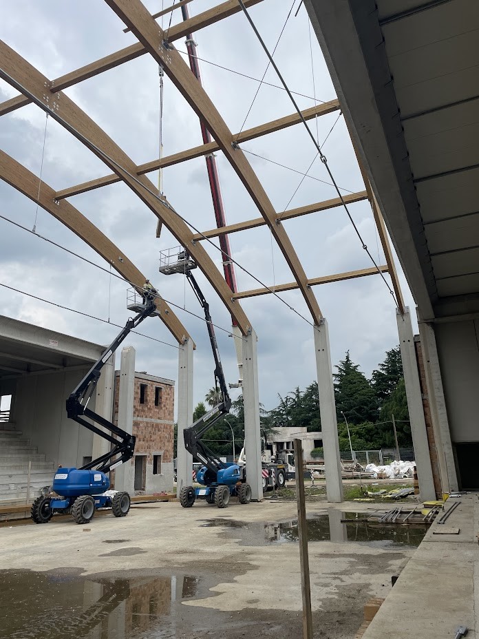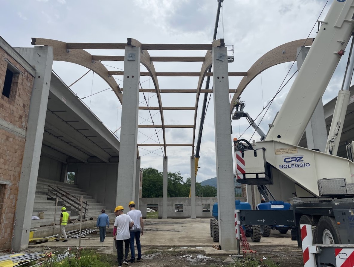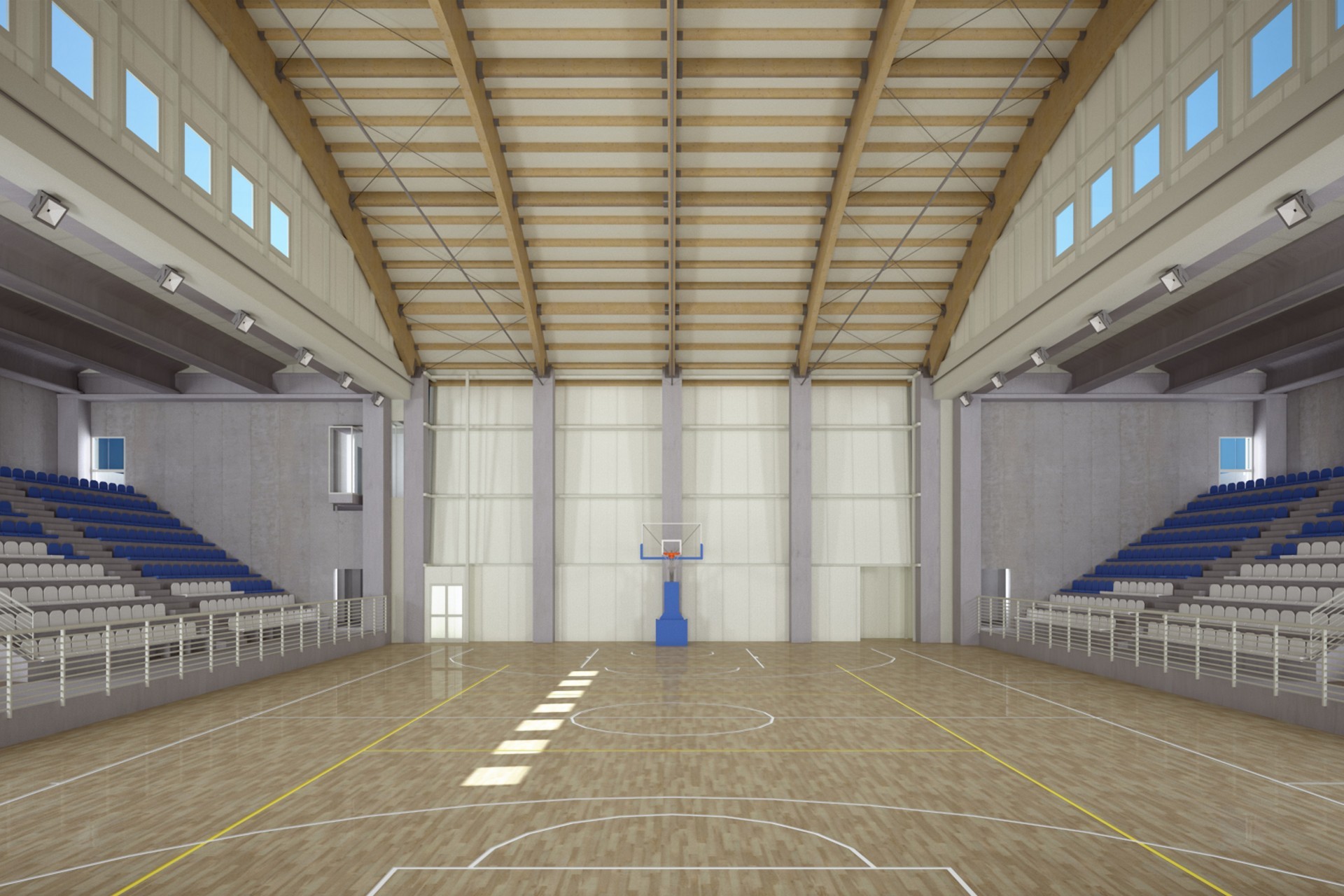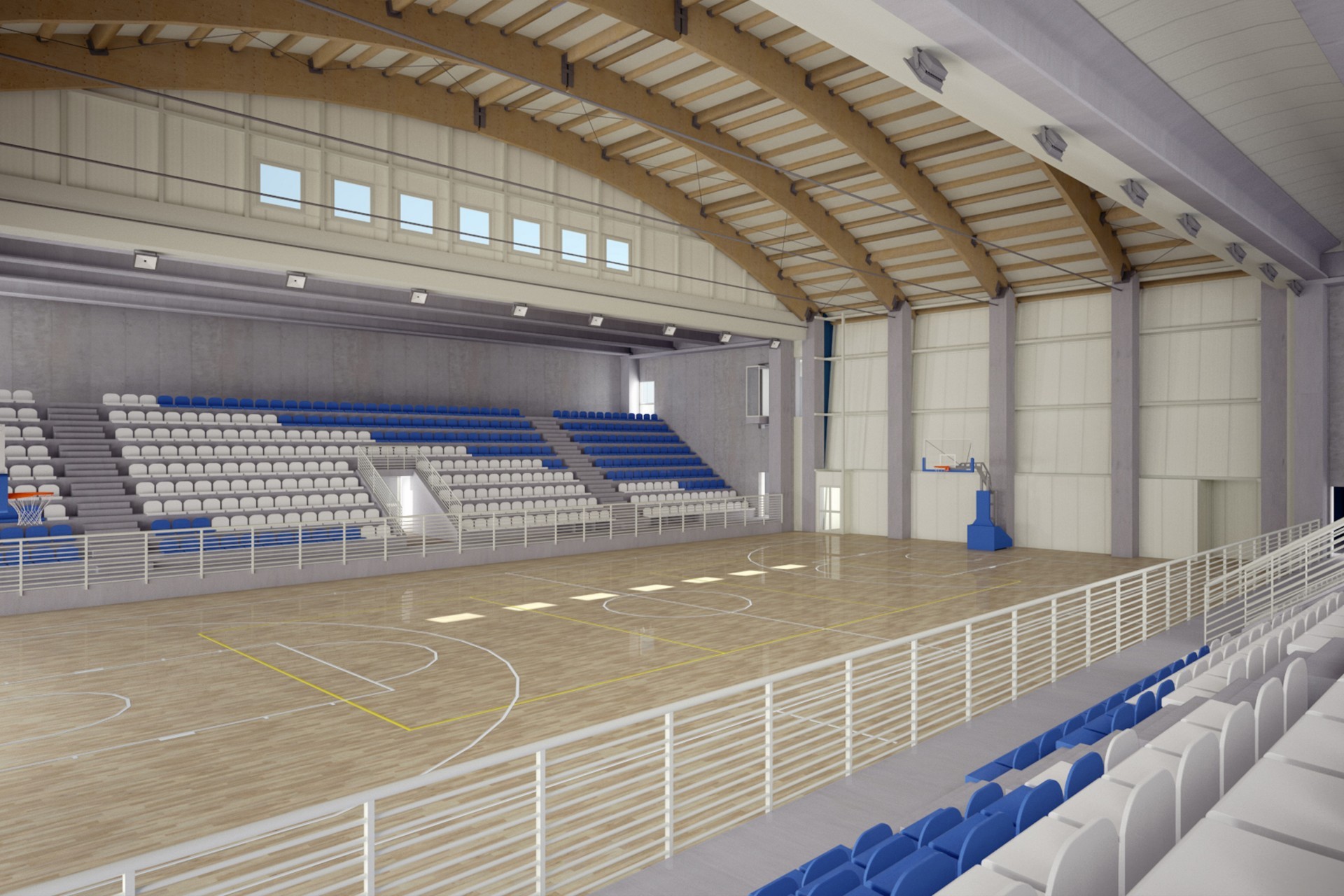 Il progetto prevede la trasformazione della ex piscina comunale, mai ultimata, in un palazzetto dello sport a Santa Maria a Vico, provincia di Caserta, sito in prolungamento Viale Libertà. Sono previsti tre corpi di fabbrica: due laterali ed uno centrale di altezza maggiore. Nei due corpi laterali sono alloggiate le gradinate, sotto le quali sono ricavati gli spogliatoi che prevedono l’ingresso diretto sul campo da gioco. Nel corpo centrale si trova li campo da gioco, per il quale è previsto sia l’uso per pallavolo che per pallacanestro. Le dimensioni complessive prevedono un’area d’impronta di 33,5m x 42,96m, con un’altezza massima pari a 14,95m. Per realizzare la struttura portante si prevede un sistema misto, costituito da elementi in c.l.s. prefabbricato per i corpi di fabbrica comprendenti gradinate e spogliatoi, da elementi in c.l.s. gettato in opera per i blocchi scale ed elementi in legno lamellare per quanto concerne la copertura del corpo centrale. Le Finiture esterne prevedono pannelli sandwich in acciaio preverniciato posti su pannelli di chiusura autoportanti in c.l.s con interposto strato coibente. Per le pavimentazioni sono previsti un parquet sportivo per il campo da gioco e gres porcellanato per gli spogliatoi.