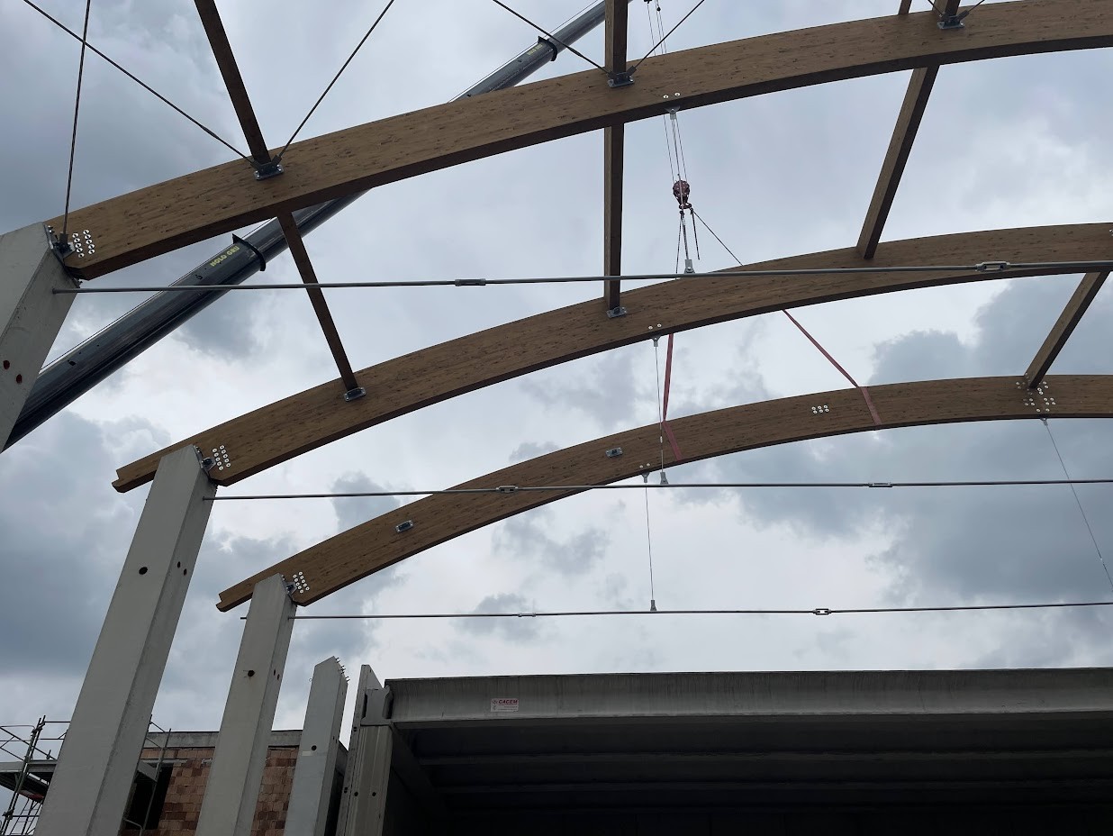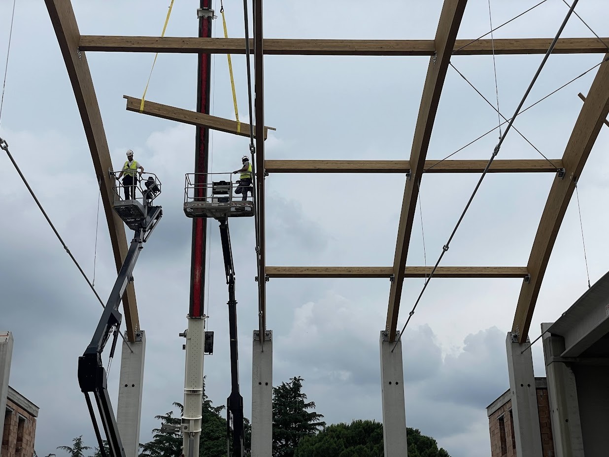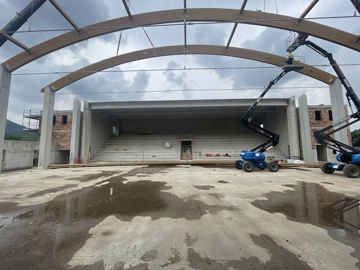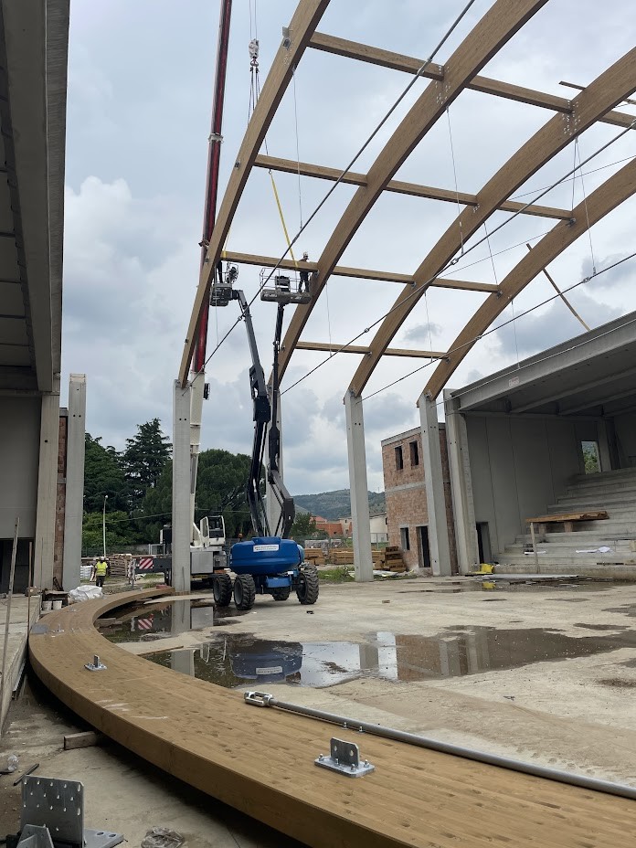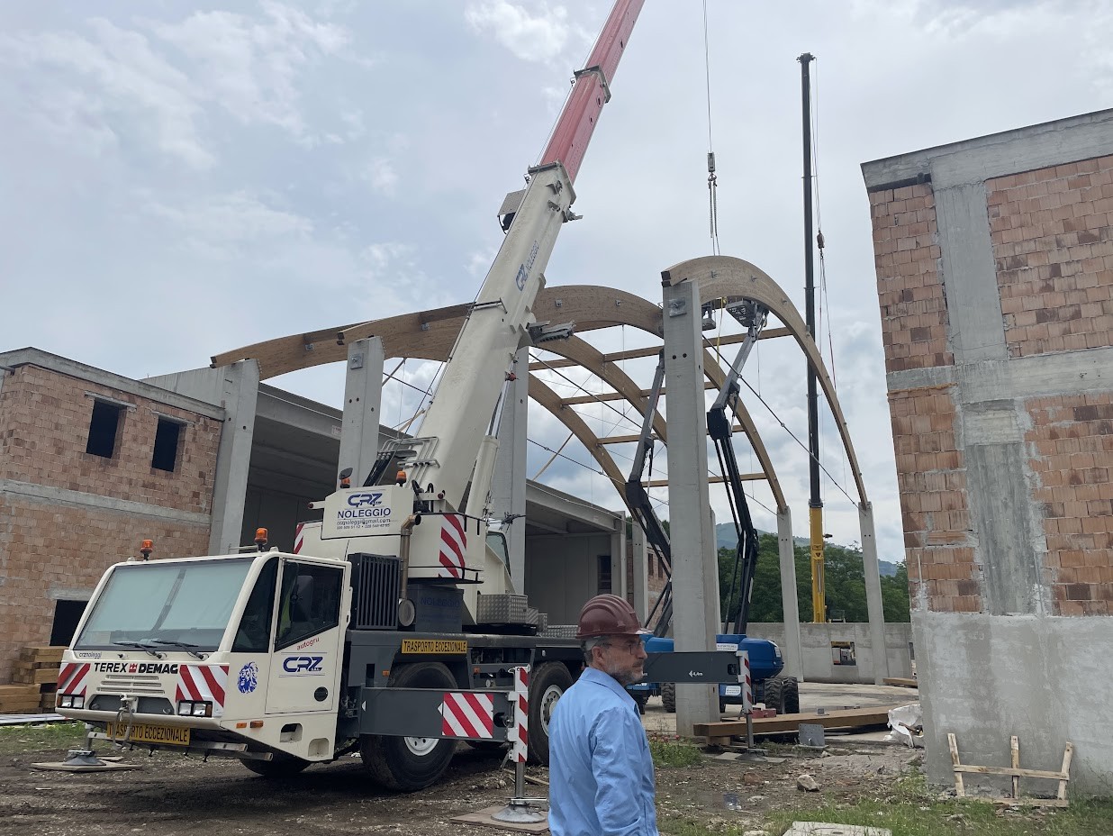 Il progetto prevede la trasformazione della ex piscina comunale, mai ultimata, in un palazzetto dello sport a Santa Maria a Vico, provincia di Caserta, sito in prolungamento Viale Libertà. Sono previsti tre corpi di fabbrica: due laterali ed uno centrale di altezza maggiore. Nei due corpi laterali sono alloggiate le gradinate, sotto le quali sono ricavati gli spogliatoi che prevedono l’ingresso diretto sul campo da gioco. Nel corpo centrale si trova li campo da gioco, per il quale è previsto sia l’uso per pallavolo che per pallacanestro. Le dimensioni complessive prevedono un’area d’impronta di 33,5m x 42,96m, con un’altezza massima pari a 14,95m. Per realizzare la struttura portante si prevede un sistema misto, costituito da elementi in c.l.s. prefabbricato per i corpi di fabbrica comprendenti gradinate e spogliatoi, da elementi in c.l.s. gettato in opera per i blocchi scale ed elementi in legno lamellare per quanto concerne la copertura del corpo centrale. Le Finiture esterne prevedono pannelli sandwich in acciaio preverniciato posti su pannelli di chiusura autoportanti in c.l.s con interposto strato coibente. Per le pavimentazioni sono previsti un parquet sportivo per il campo da gioco e gres porcellanato per gli spogliatoi.