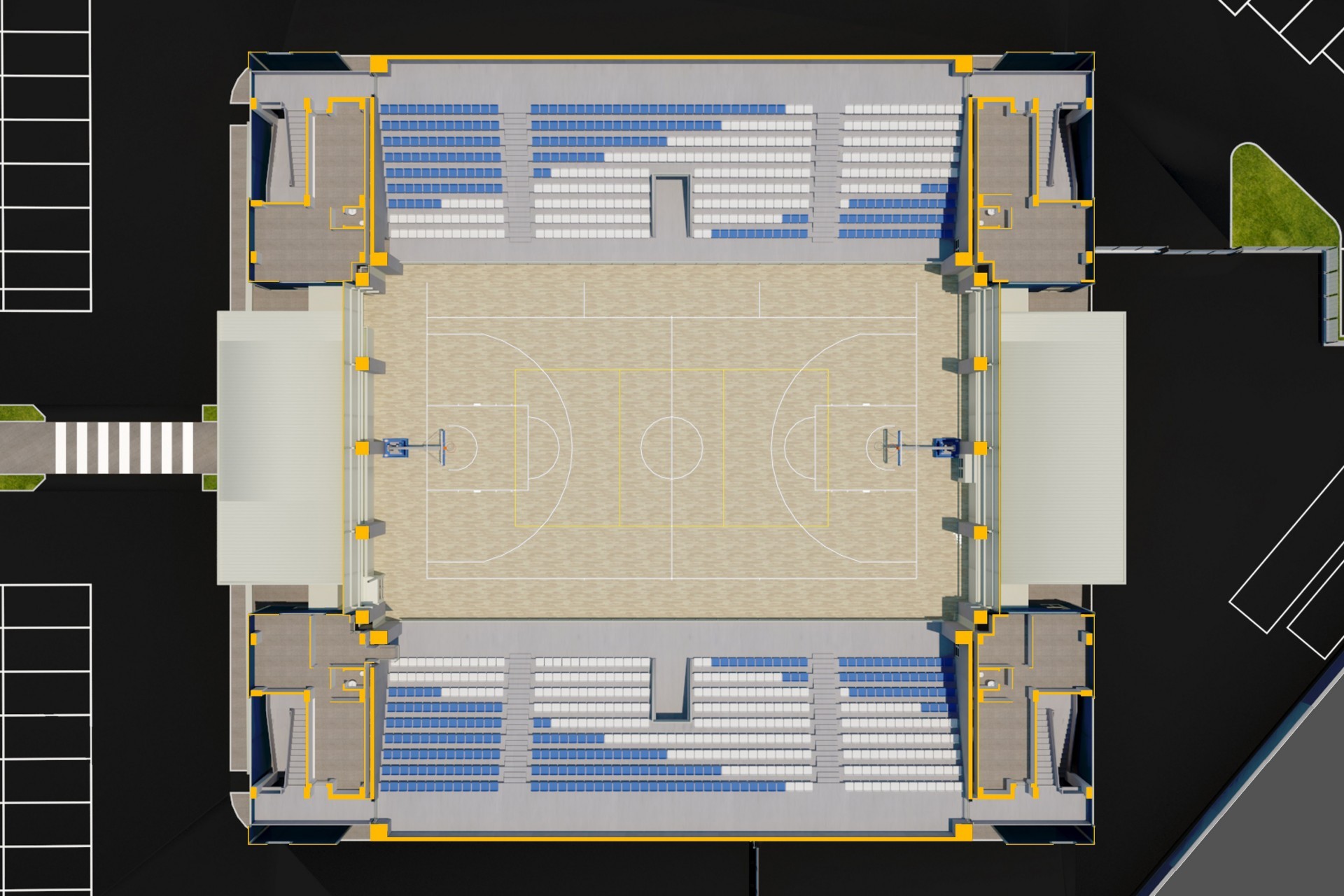 L’intero complesso bianco/azzurro prevede 930 posti a sedere ed un campo da gioco polivalente, per la pallavolo e per la pallacanestro.
