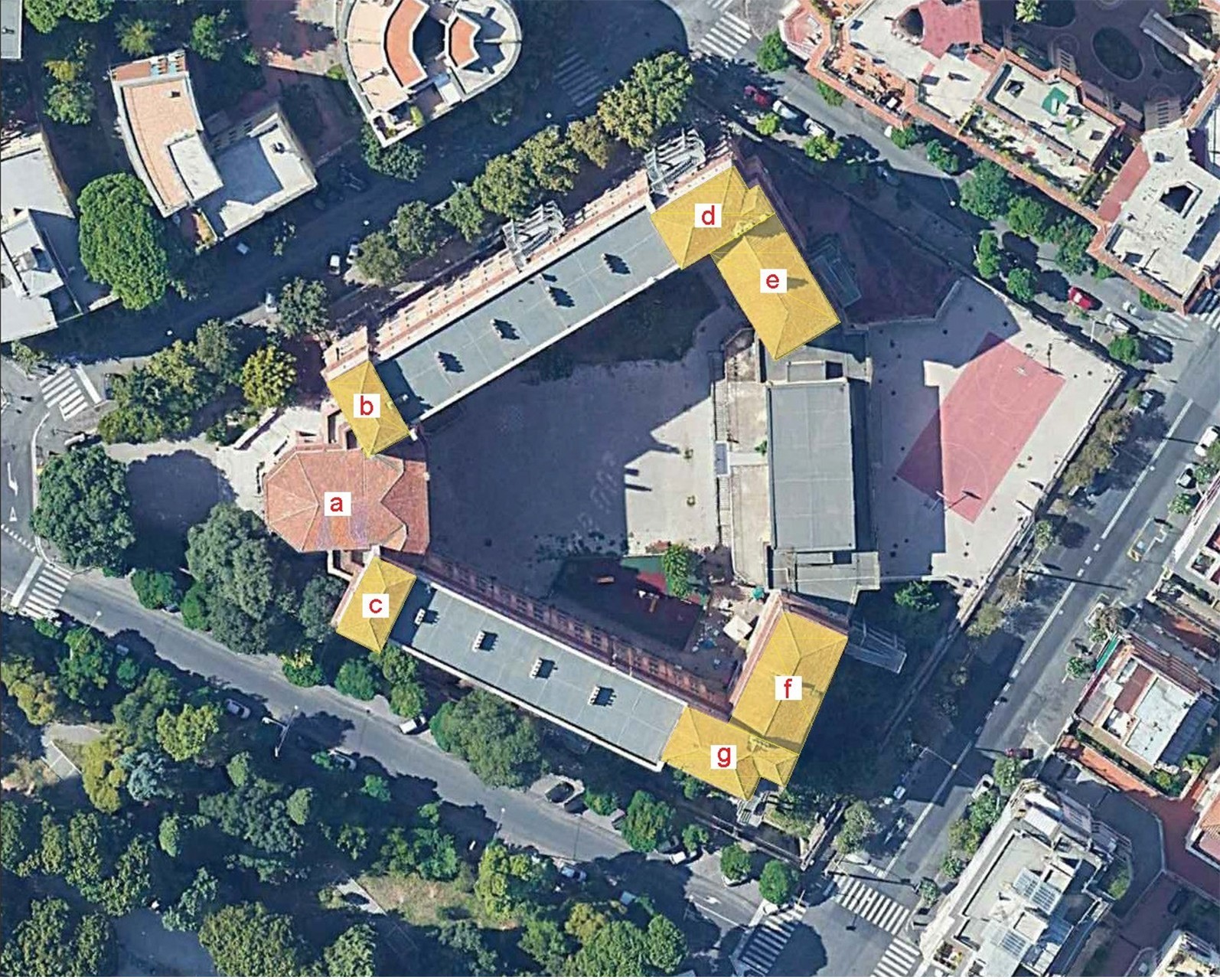 Le coperture oggetto di intervento di risanamento conservativo e messa in sicurezza delle stesse sono opere costituite da una ossatura portante in legno massiccio. Gli esemplari lignei che costituiscono la struttura portante sono travi “con cuore”, largamente utilizzate nelle costruzioni fino alla seconda metà del ‘900. Si tratta di travi che nascono dalla segatura “cuore in scatola” – il midollo rimane all’interno del pezzo con una certa tolleranza per l’esposizione. Questo tipo di trave impiegata risulta aver maggior resistenza rispetto ad altri tipi di tagli. Le coperture “c” e “b” rivolte ad est sono poste al 5° livello al di sopra di un vano scala e un ascensore. Tra la copertura e l’ambiente sottostante è posizionato un controsoffitto munito di botole di ispezione. Il sottotetto così configurato con presenta aperture verso l’esterno e misura circa 11 metri di profondità per una larghezza pari a circa 5 metri di larghezza. La struttura portante delle suddette coperture, poggiante ad una quota d’imposta pari a 2,70 circa rispetto al piano di calpestio, è rappresentata da due travature reticolari lignee dette capriate, sulle quali appoggiano un ordine di travi che insieme alla trave di colmo supportano la struttura dei panconcelli. Le coperture “g” e “d” rivolte a nord e a sud sono poste anch’esse al 5° livello. La struttura portante di entrambe le coperture è posta ad una quota d’imposta pari a circa 2,60 metri rispetto al piano di calpestio, poggianti su muratura di tufo listellata. A fare da supporto è la presenza di un muro di spina posto in maniera longitudinale rispetto allo sviluppo della pianta. L’intera copertura è frutto dell’intersezione di due coperture a padiglione una più grande dell’altra con l’aggiunta di un piccolo abachino sormontato esternamente da 4 camini che includono tubi di ventilazione. La struttura lignea è composta da 3 capriate che generano l’inclinazione. L’ambiente sottostante è dotato di ben 6 aperture semicircolari prive di serramenti. Le coperture “e” e “f” rivolte a ovest, sono poste al 4°livello in corrispondenza di 3 aule e un corridoio. Tra la copertura e l’ambiente sottostante è posizionato un controsoffitto munito di botole di ispezione. Il sottotetto così configurato con presenta aperture verso l’esterno e misura circa 11 metri di profondità per una larghezza pari a circa 5 metri di larghezza. La struttura portante di entrambe le coperture da due capriate ed è posta ad una quota d’imposta pari a circa 4,45 metri rispetto al piano di calpestio, poggianti su muratura di tufo listellata. In muratura di tufo sono composti anche i 4 muri di spina che rappresentano un supporto dal punto di vista statico alla suddetta copertura. La pianta di tali coperture a semipadiglione è pressoché rettangolare.