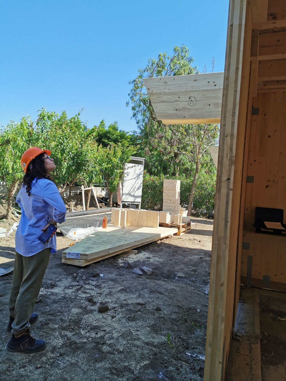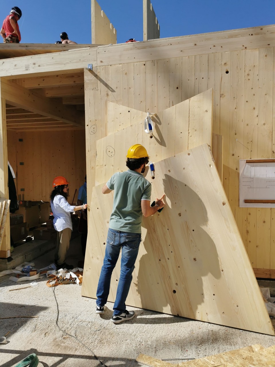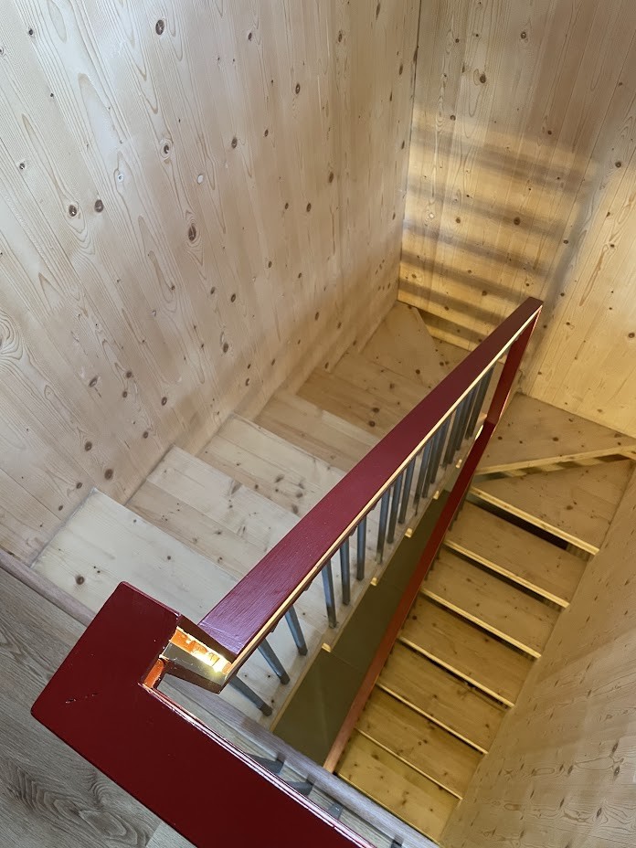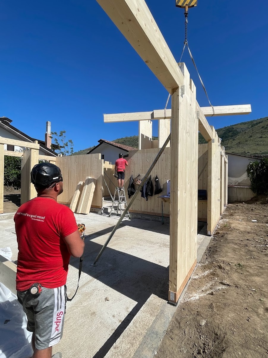L’edificio è realizzato con una struttura portante di pannelli prefabbricati di legno lamellare incrociato e stratificato (X-LAM). Tali pannelli sono formati da più strati di legno lamellare sovrapposti e incollati l'uno sull'altro in modo tale che le fibre di ogni singolo strato risultano ruotate di 90° rispetto a quelle degli strati adiacenti, conferendo così ai pannelli un’ottima resistenza flessionale e al taglio in entrambe le direzioni del suo piano.