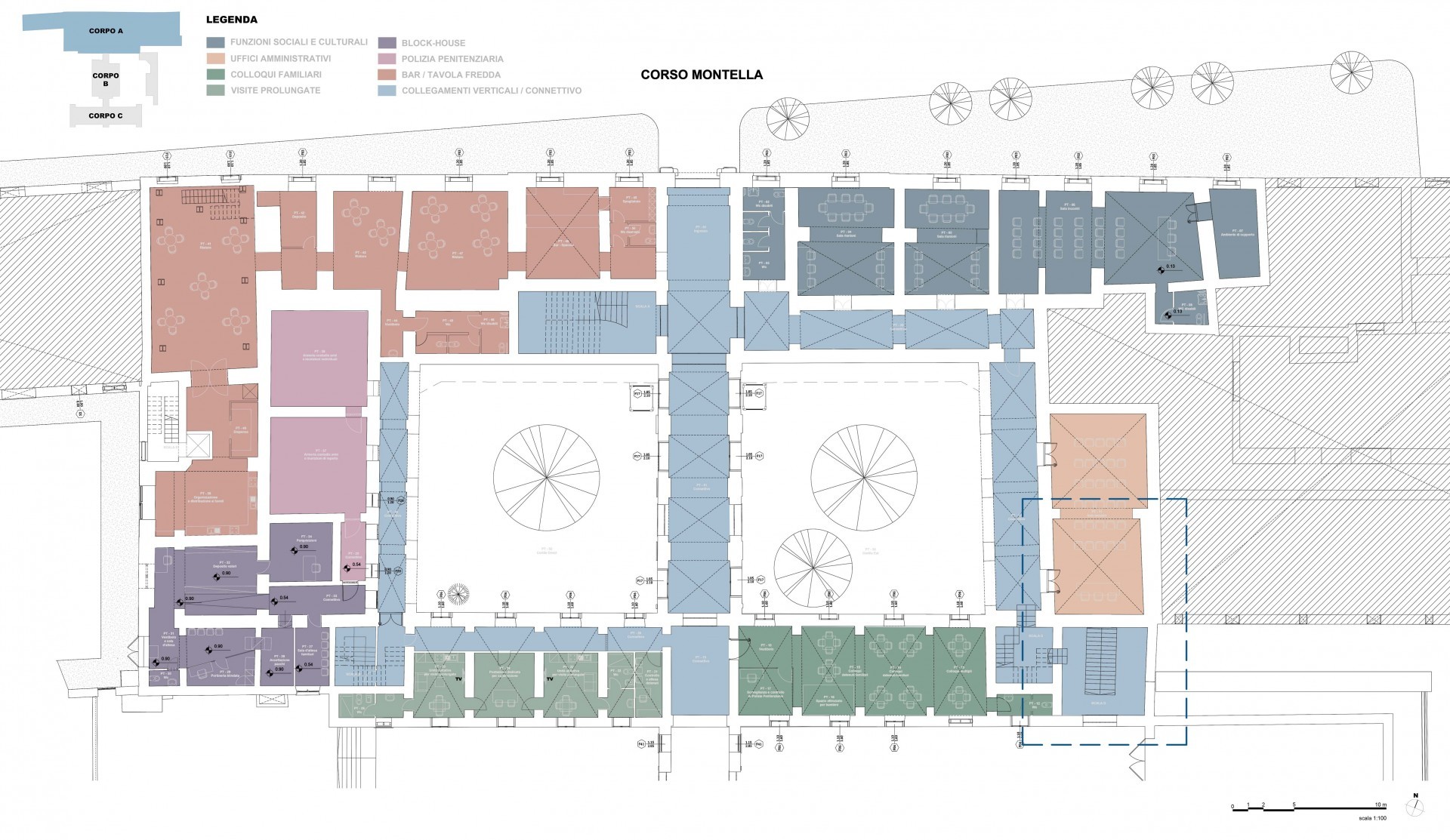 In particolare per quanto attiene agli interventi di rifunzionalizzazione, gli spazi maggiormente rappresentativi del Corpo A saranno destinati a funzioni sociali e culturali e dovranno essere adeguatamente separati dalle funzioni di gestione e di conduzione delle attività detentive.
